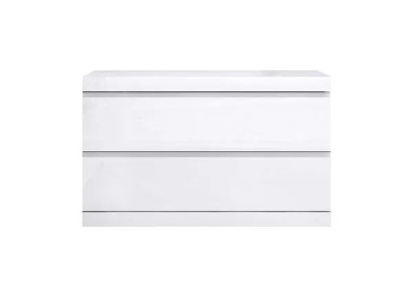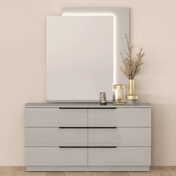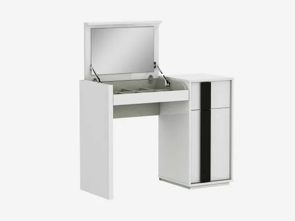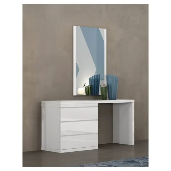 Kimberly vanity dresser comes in high gloss white with mirror, self -closing runners and black Matt handles.
