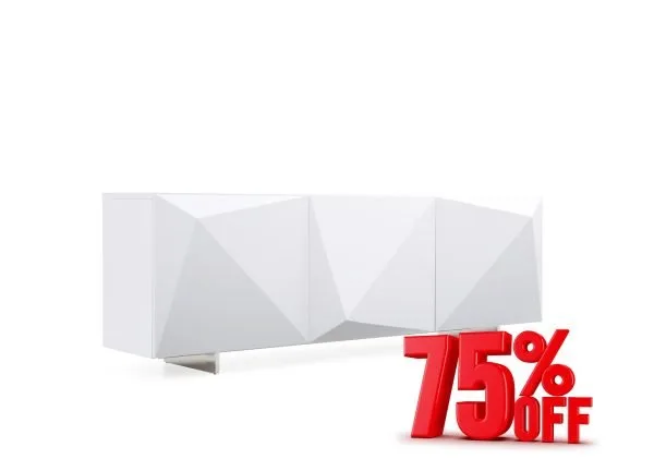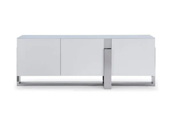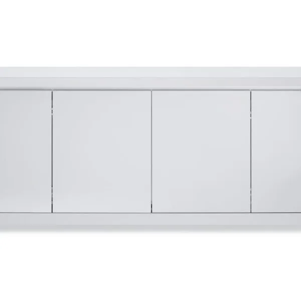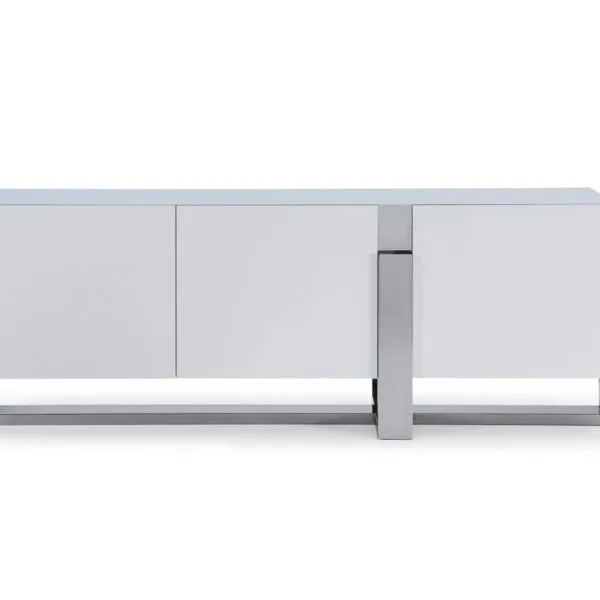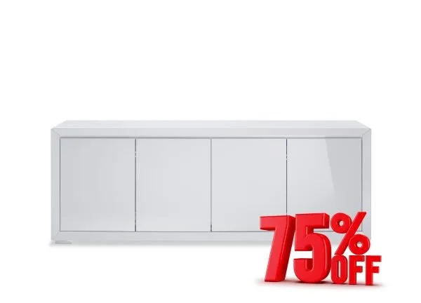 Pendenza Buffet 4 door MDF in high gloss white and polished stainless steel body with matte behind doors. Price Reflected Includes 75% Discount