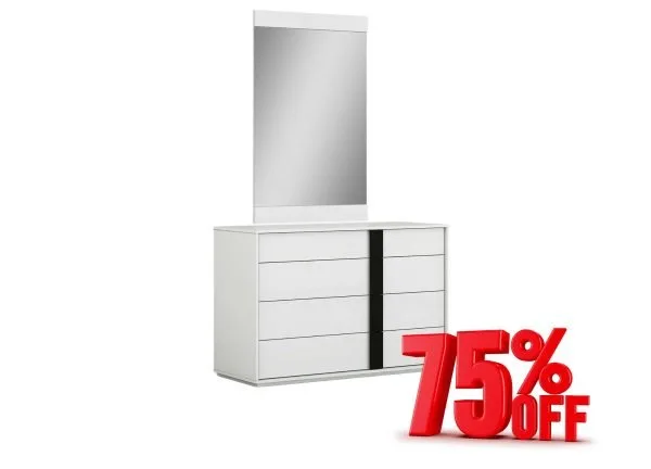 Kimberly vanity dresser comes in high gloss white with mirror, self -closing runners and black Matt handles. Price Reflected Includes 75% Discount Final Sale Item: Discounted due to minor imperfections.