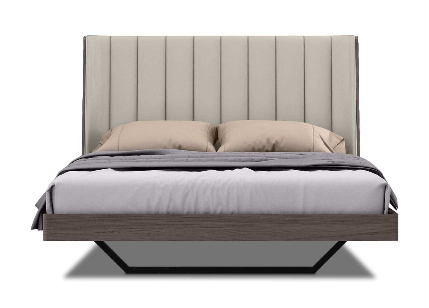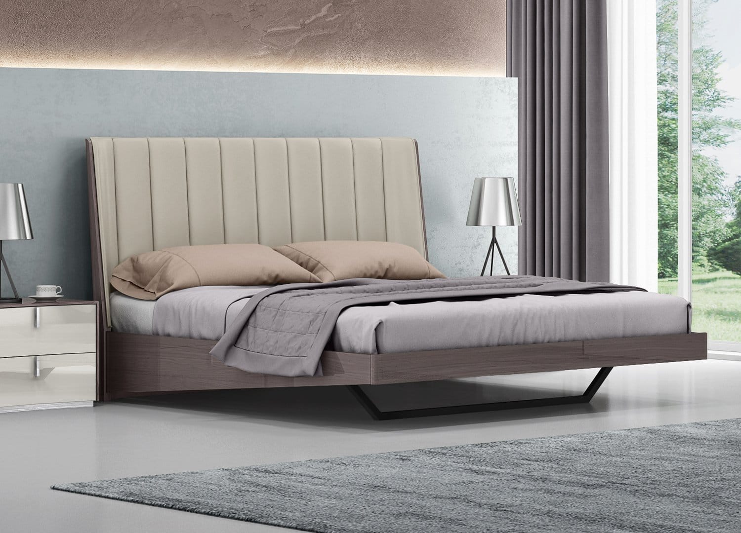 Berlin Bed Queen, in High Gloss Chestnut Lacquer, Upholstered Vertical Padded Headboard in Light Grey Faux Leather, Black Steel Base