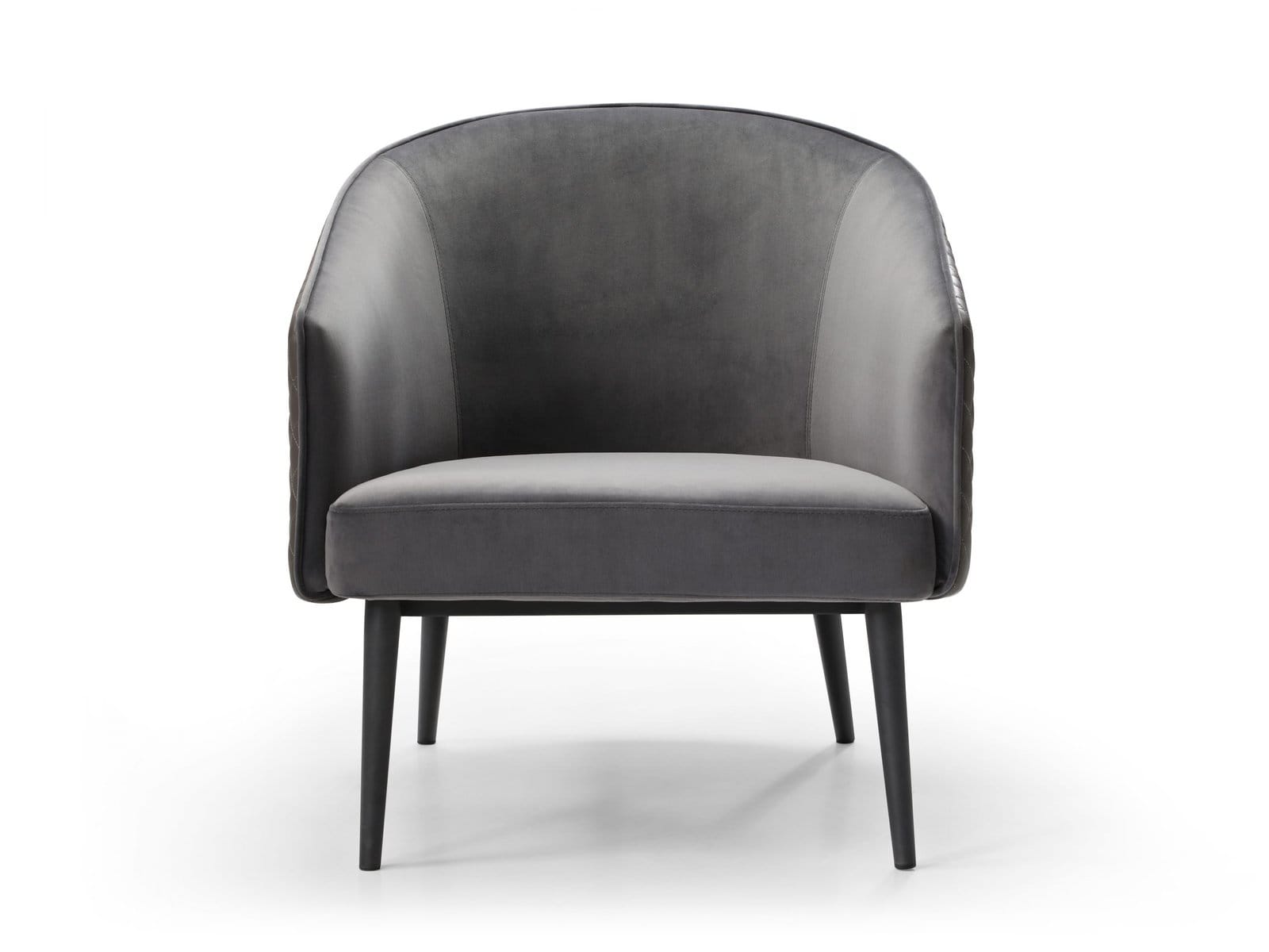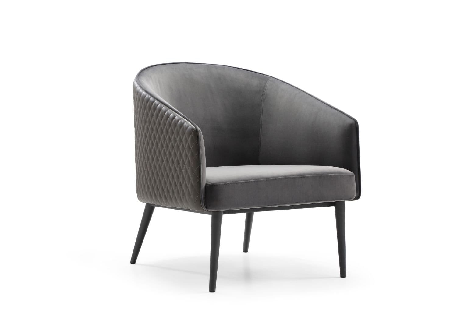 Boston Leisure Chair, Front in Grey Velvet, Back in Dark Grey Faux Leather, Legs in Sanded Black Powder-Coated Steel.