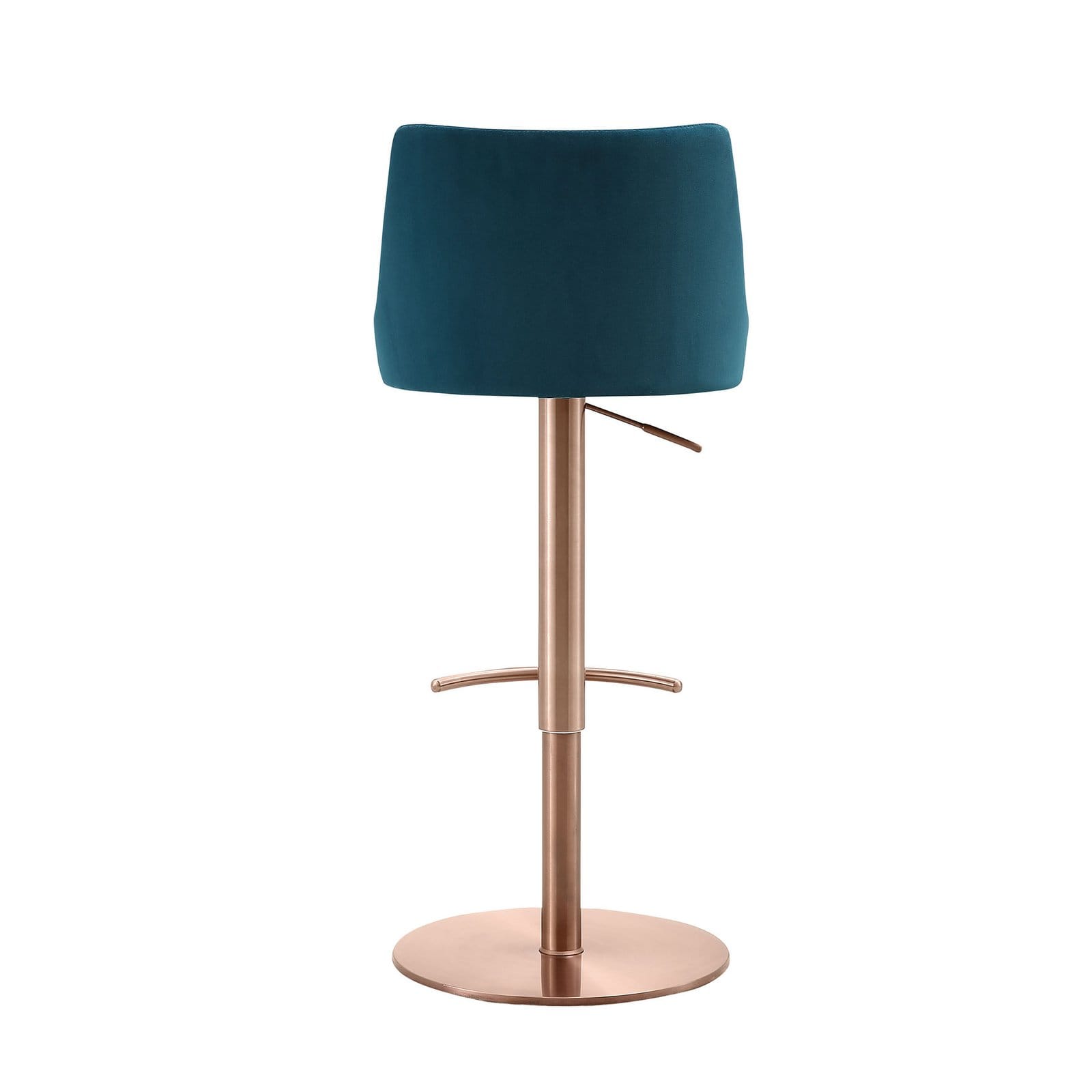 Carter Barstool, in Green Velvet, Adjustable Height with Gas Lift, Swivel Base in Gold Color. Carter Barstool, in Blue Velvet, Adjustable Height with Gas Lift, Swivel Base in Rose Gold Color. Carter Barstool, in Light Grey Faux Leather, Adjustable Height with Gas Lift, Swivel Base in Brushed Stainless Steel, Silver Color.