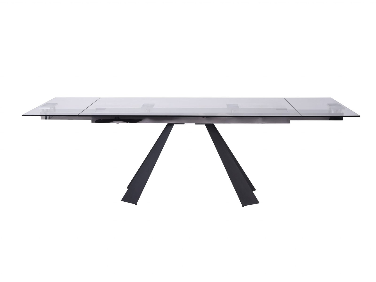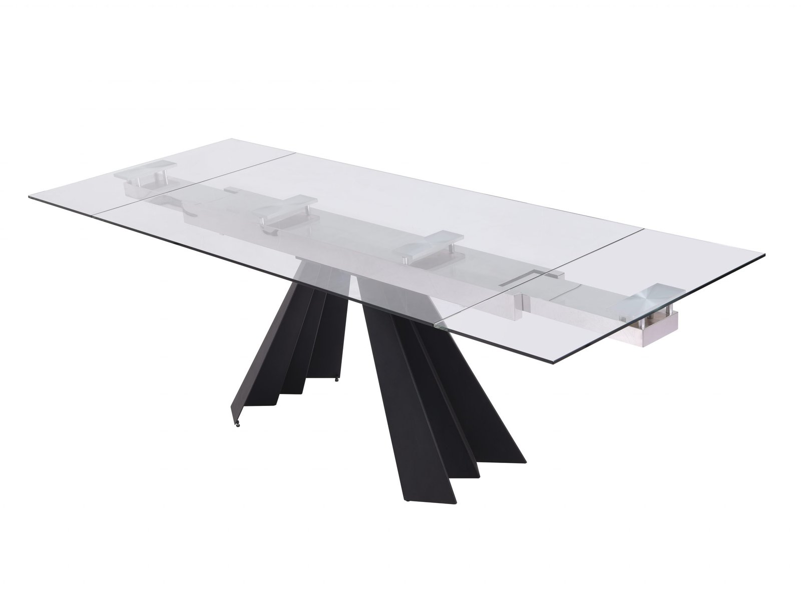 Chicago Extendable Dining Table: Extendable Dining Table, 10mm tempered clear glass top with Sanded black metal base. Extends from 63″ to 95″