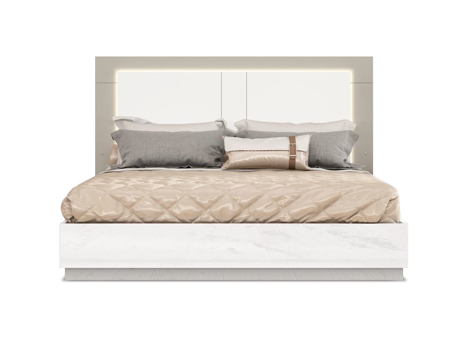 Bed King White High gloss Headboard with Light Grey Borders and LED Light Base in Polished Stainless Steel, Silver Color.