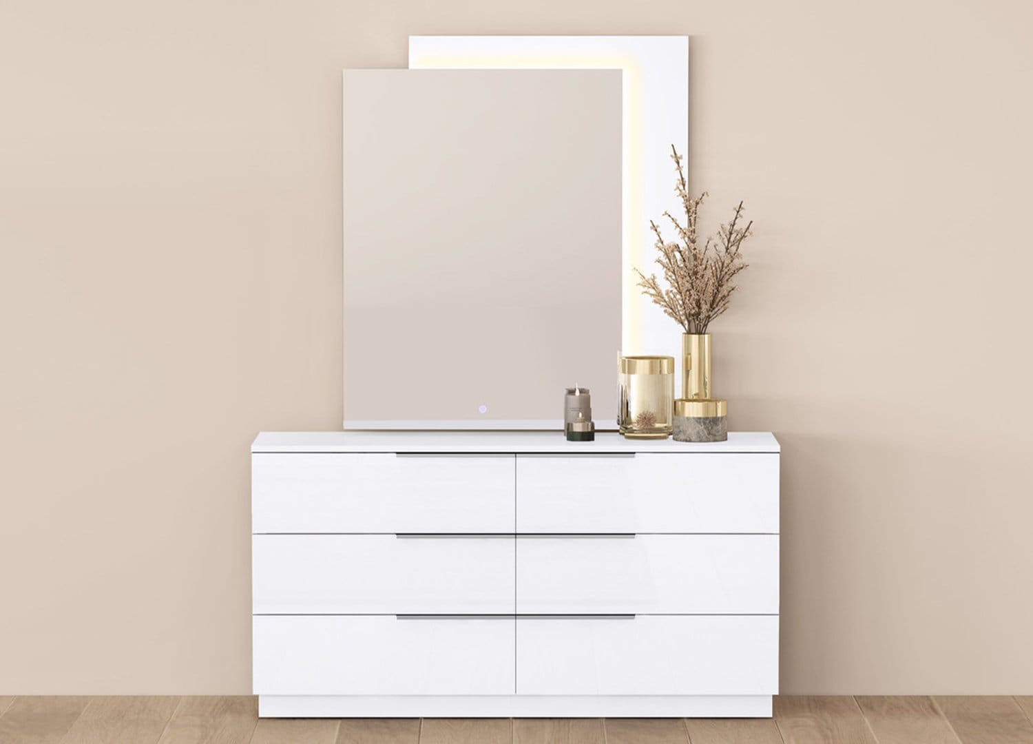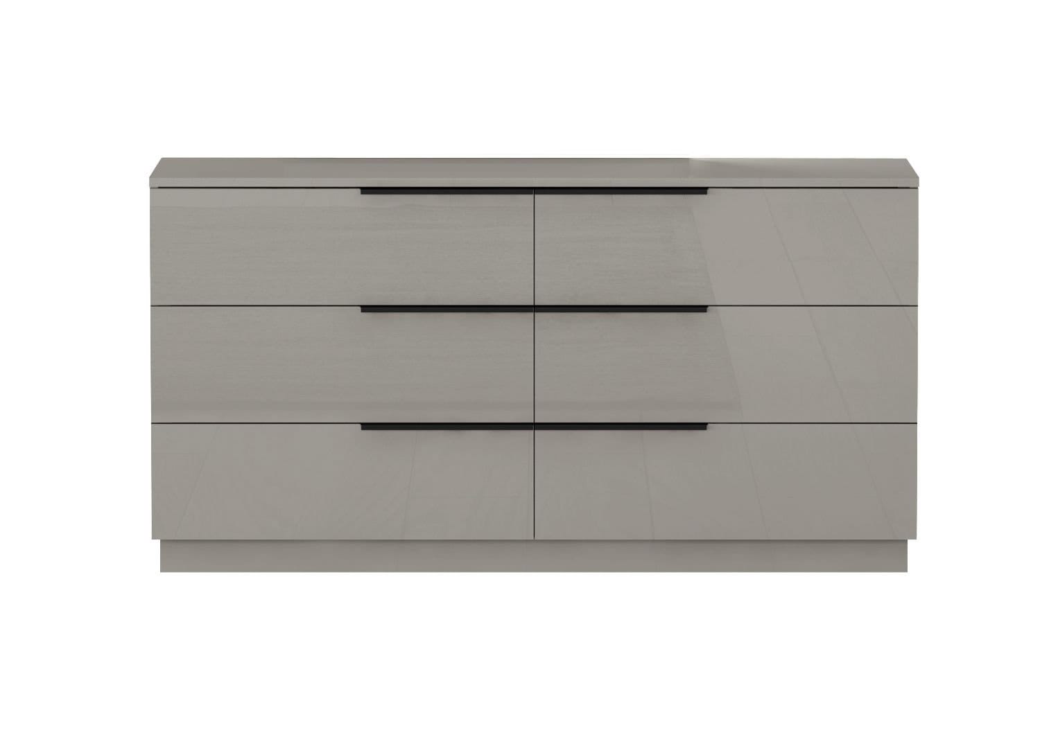 Damien Double Dresser Available in 2 colors: High Gloss Light Grey with Matte Black Handles. High Gloss White Lacquer with Silver Stainless Steel Handles 6 Drawers with Self-Closing Runners Complete Collection with Damien Nightstand & Damien Mirror .