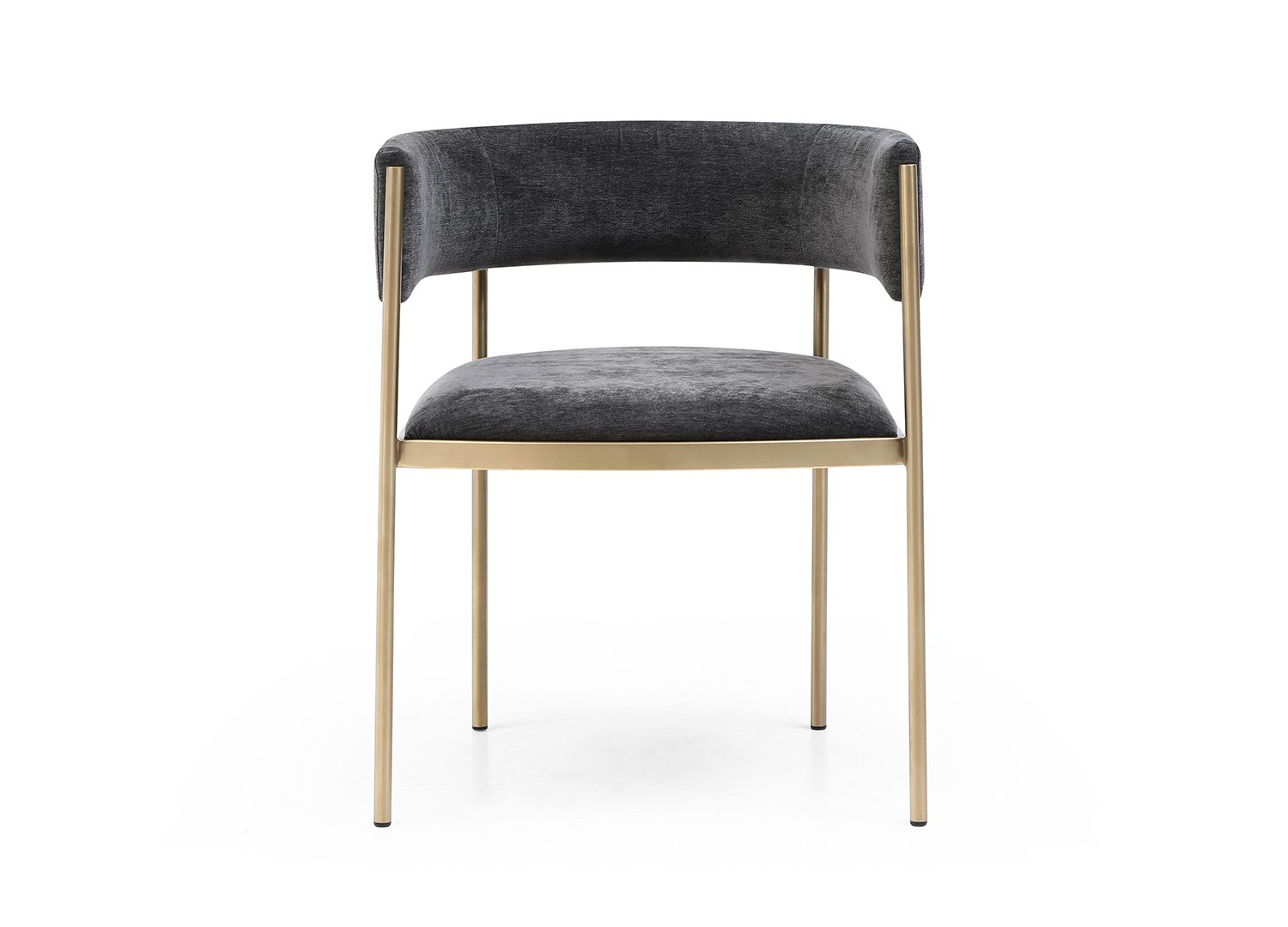 Envie Dining Armchair, Available in Light Grey Fabric and Black Sanded Coated Steel Frame and Legs or in Charcoal Fabric and Gold Brushed Brass Stainless Steel Frame and Legs. Armchair can be paired with the Envie Dining Table .