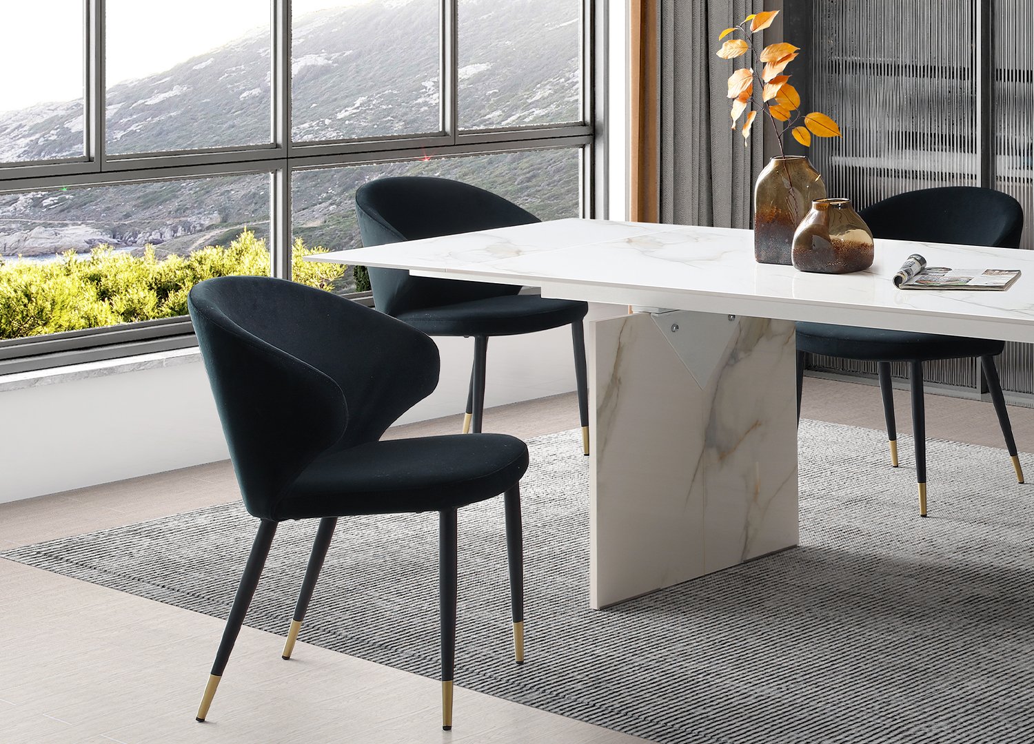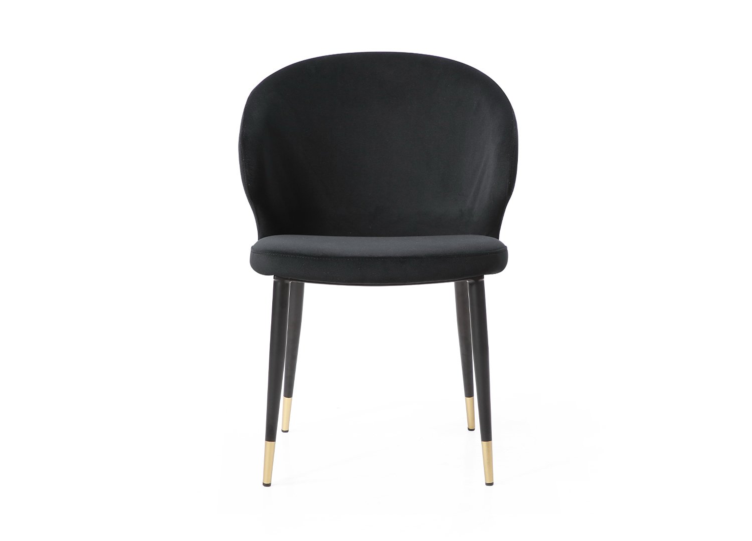 Gracie Dining Chair, Black Velvet, Black Steel Powder-Coated Legs with Gold Bottom Caps.