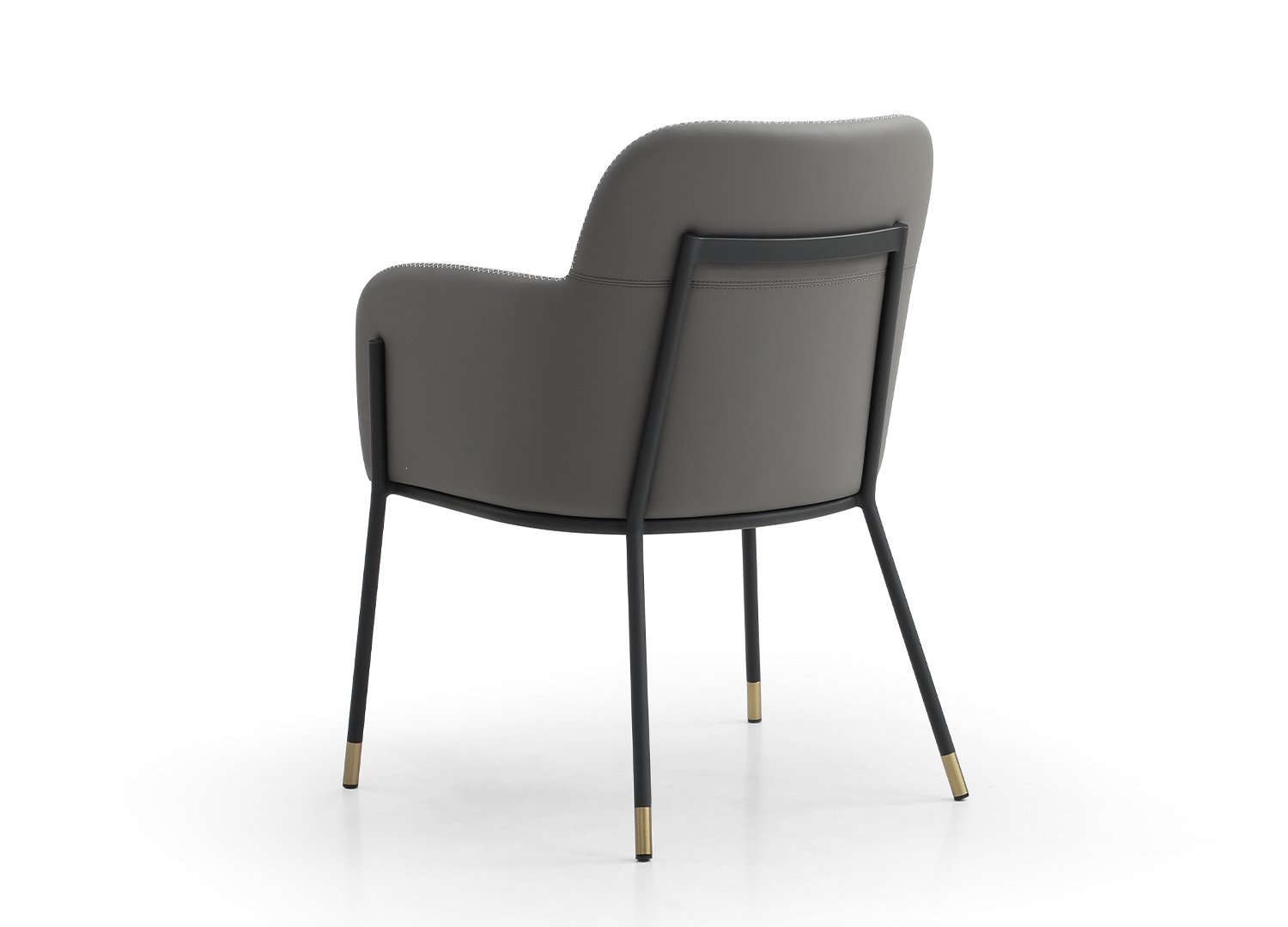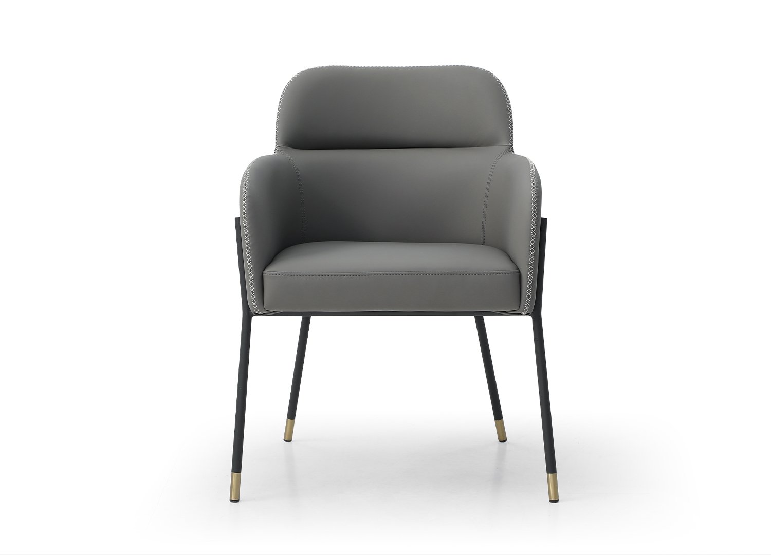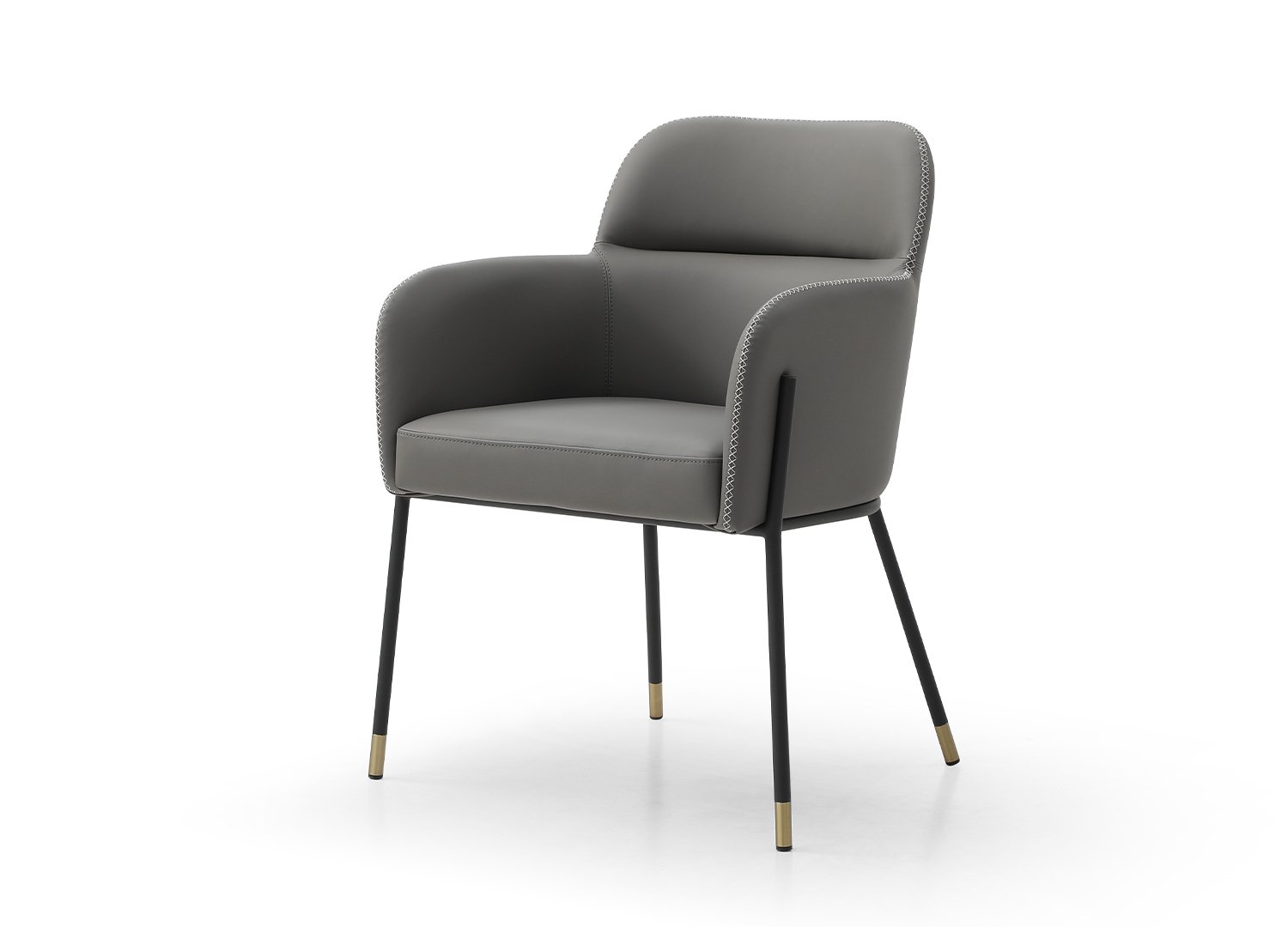 Heidi Dining Armchair, available in 3 colors: Camel Faux Leather, with Dark Grey Stitching, Legs in Black Powder-Coated Steel with 2″ Caps in Gold Brushed Brass. Heidi Dining Armchair, in Dark Grey Faux Leather, with Light Grey Stitching, Legs in Black Powder-Coated Steel with 2″ Caps in Gold Brushed Brass. Heidi Dining Armchair, in Light Grey Faux Leather, with Dark Grey Stitching, Legs in Black Powder-Coated Steel with 2″ Caps in Gold Brushed Brass. Armchair can be paired with Heidi Dining Table .