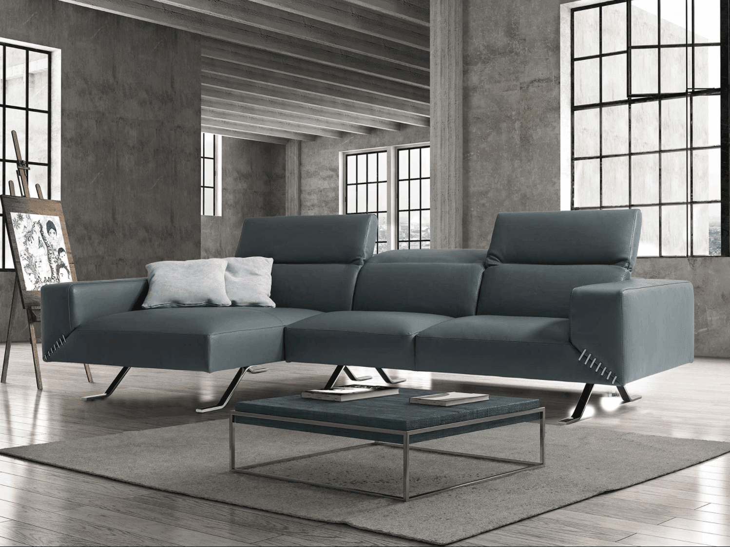 Henry Sectional: Made in Italy Chaise on left when facing Grey top grain Italian Leather Adjustable head rest.