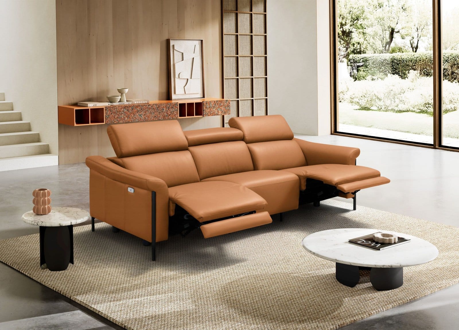 Martine Recliner Sofa: Upholstered in Italian top grain Leather Available in Blue, Camel and Light Grey Electric Reclining Function Adjustable Headrest Black Metal Legs.