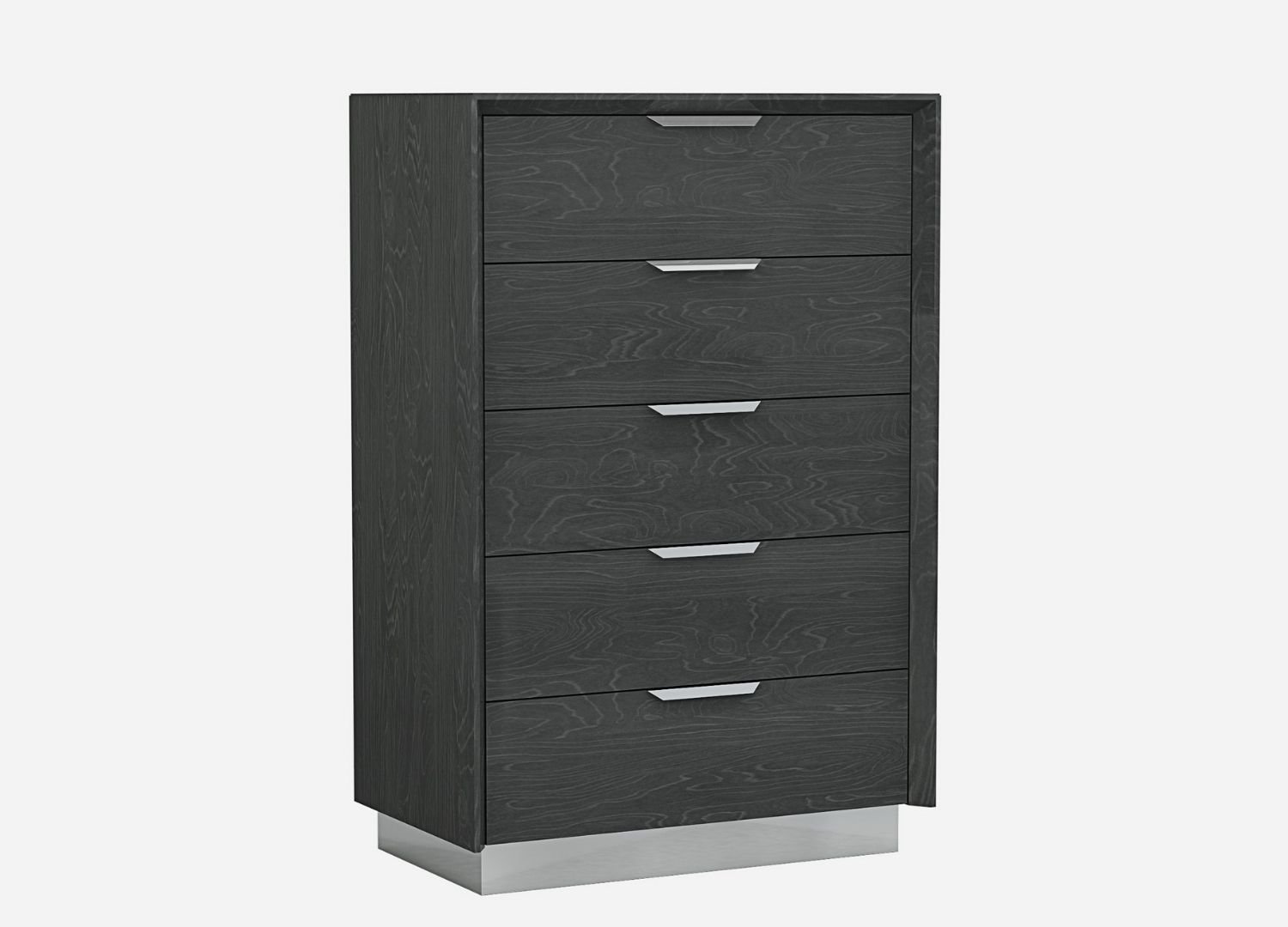 High gloss grey with stainless steel trim. 5 drawers with self-close runners. Stainless steel handles.