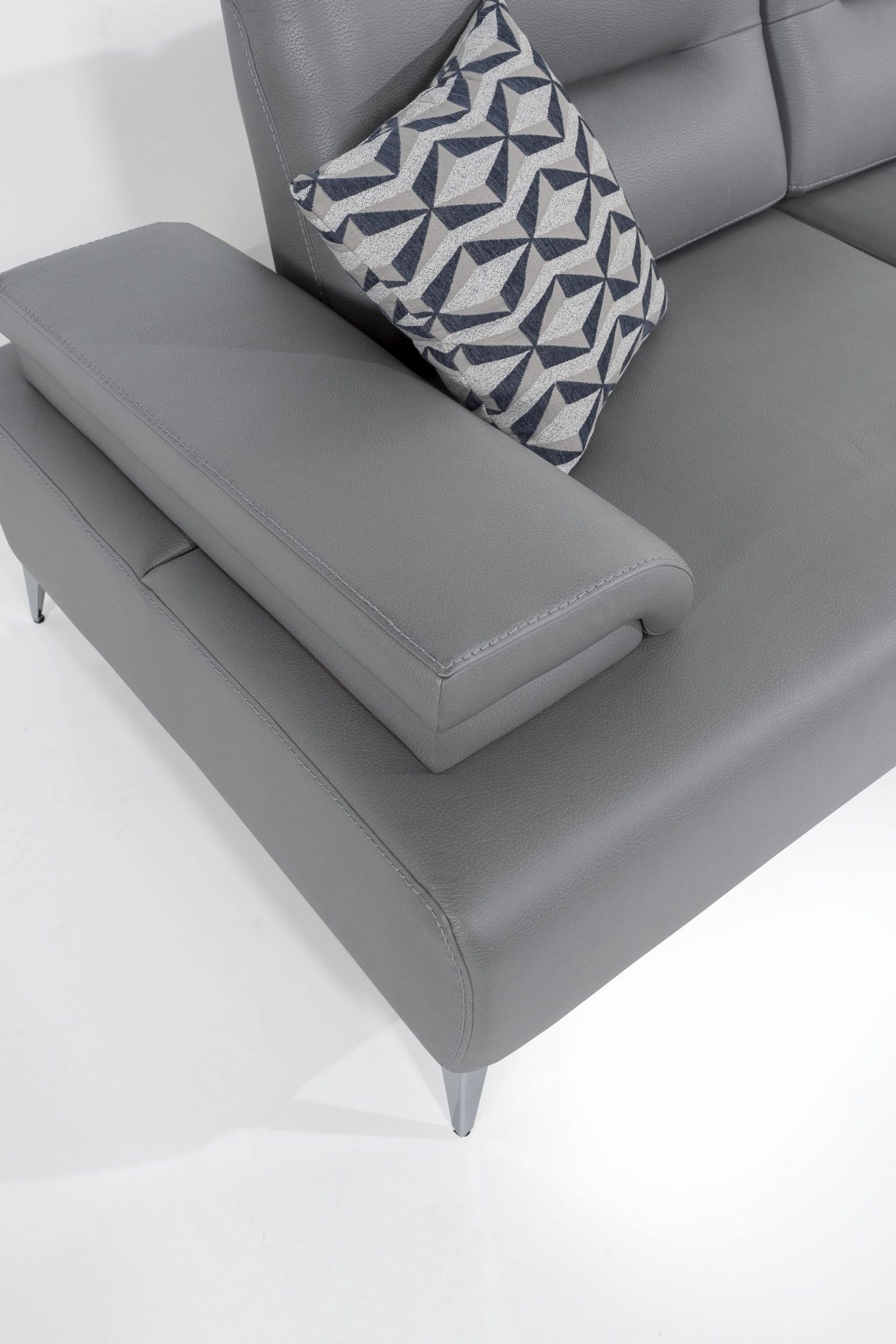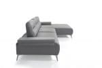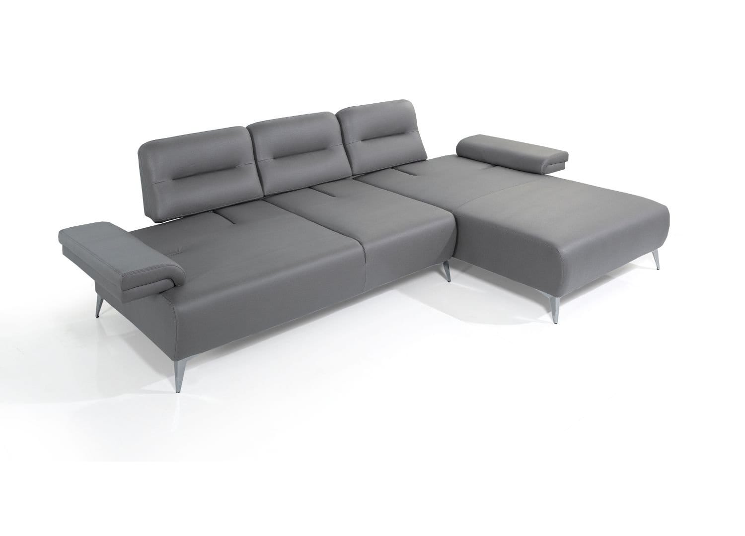Ruslan Sectional: Corner Sofa, L-shaped sofa Available in Light Grey Nubuck Leather Right Chaise when Facing Slide out Backrest and Armrest 3 Decorative Linen Cushions Legs in Nickel, Silver Color