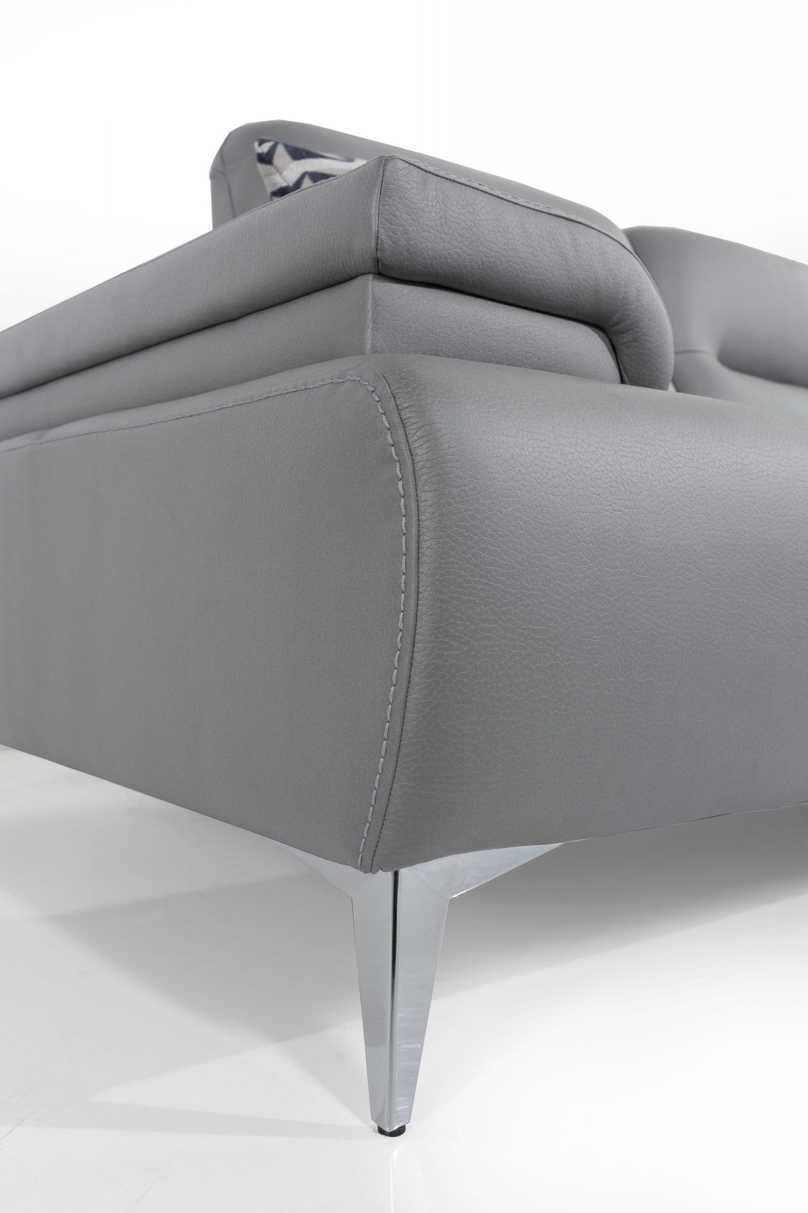 Ruslan Sectional comes in light gray leather with a right chaise when facing in, slide-out backrest and armrest with 3 linen pillows, and nickel chrome legs. Price Reflected includes 40% Discount