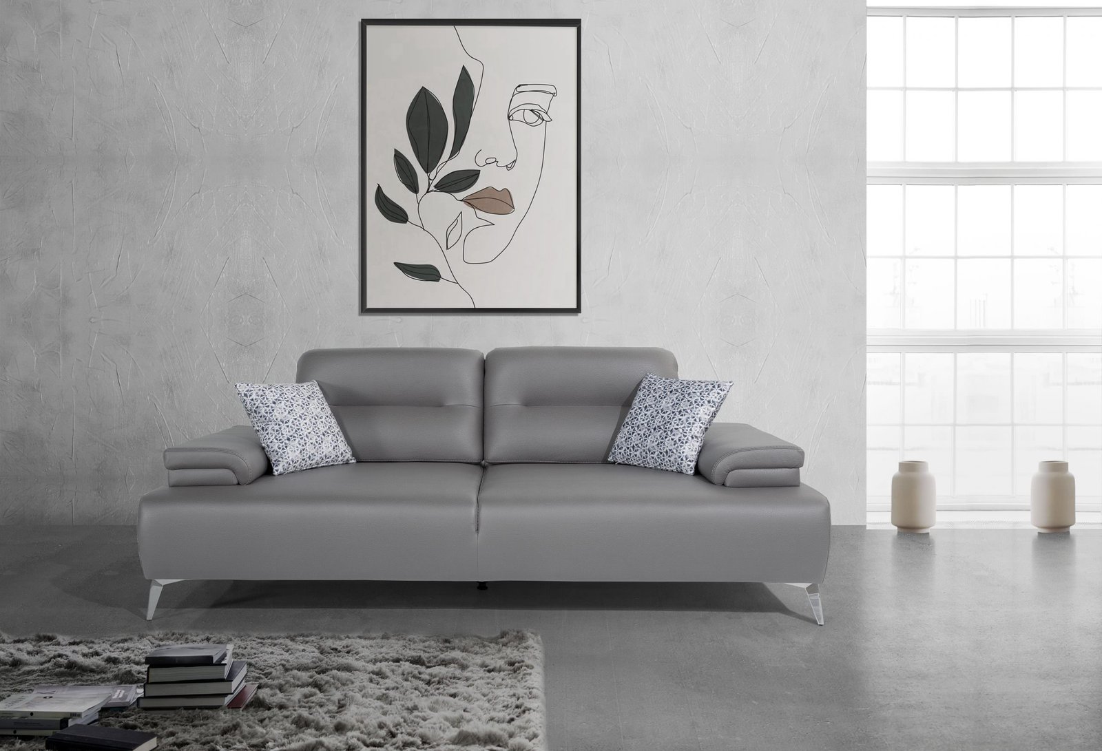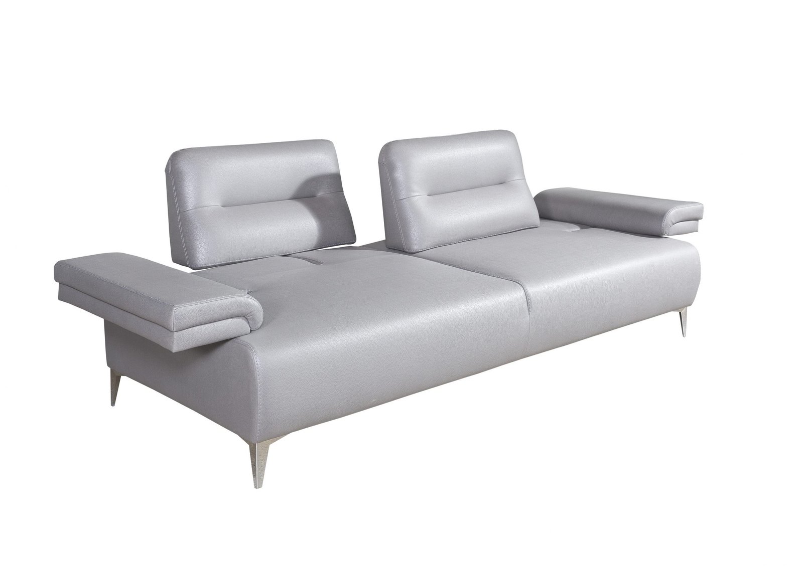 Modern Sofa, Light Grey Nubuck Leather 2 Decorative Blue Cushions Slide out Backrest and Armrest Legs in Nickel, Silver Color