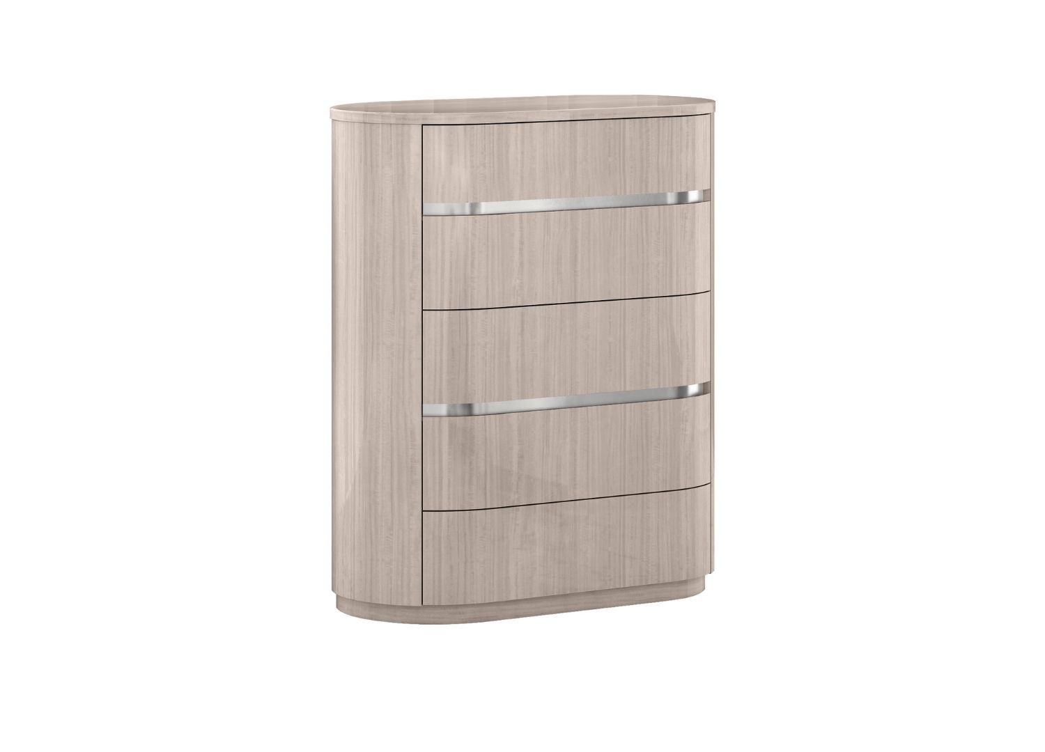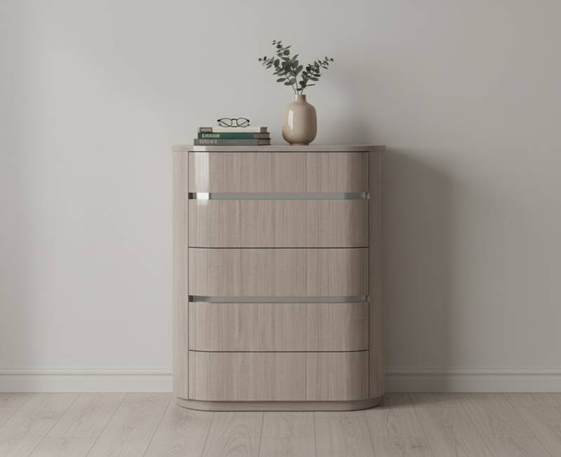 Waves Chest of Drawers High Gloss Beige 5 Drawers with Self-Closing Runners 2 Silver Stainless Steel Stripes. Chest drawers complete the Waves Bedroom Collection .